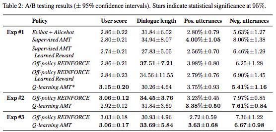 In conclusion, the two policies Q-learning AMT and Off-policy REINFORCE have demonstrated substantial improvements over all other policies. Further, the Q-learning AMT policy achieved an average Alexa user score substantially above the average of the all teams in the Amazon Alexa competition semi-finals. This strongly suggests that learning a policy through simulations in an Abstract Discourse MDP may serve as a fruitful path towards developing open-domain socialbots. The performance of Off-policy REINFORCE suggests that optimizing the policy directly towards user scores also may serve as a fruitful path. In particular, Off-policy REINFORCE obtained a substantial increase in the average number of turns in the dialogue compared to the average of all teams in the semi-finals, suggesting that the resulting conversations are significantly more interactive and engaging. Overall, the experiments demonstrate the advantages of the ensemble approach, where many different models output natural language responses and the system policy selects one response among them. With more interactions and data, the learned policies are bound to continue improving。