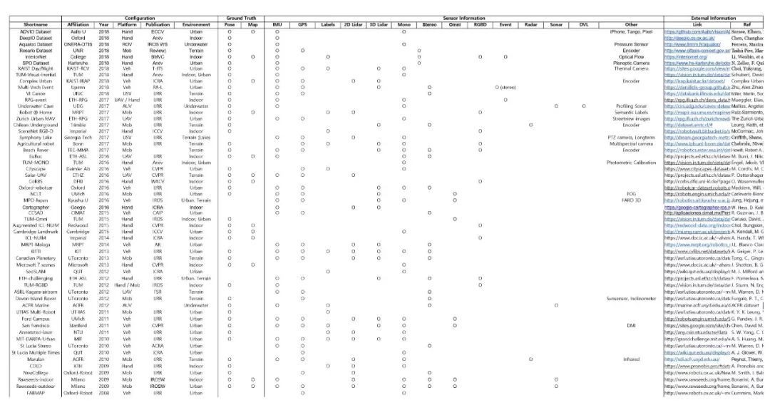 下图对每个数据集的来源机构,年份,环境,是否包含 GT pose,GT Map,IMU,GPS,语义标签,LIDAR,相机,事件相机,深度相机,雷达,声纳,多普勒速度记录,或其他相关信息进行了总结。