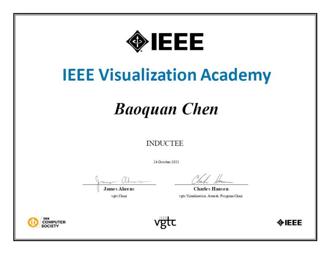 可视化学院入选名单每年在 IEEE VIS 上公布,首届入选会员为该会议历史上终身成就奖和杰出贡献奖获得者,此后每年通过推荐、选举产生。2021年包括陈宝权教授在内,共有4人入选,累计入选者49人。