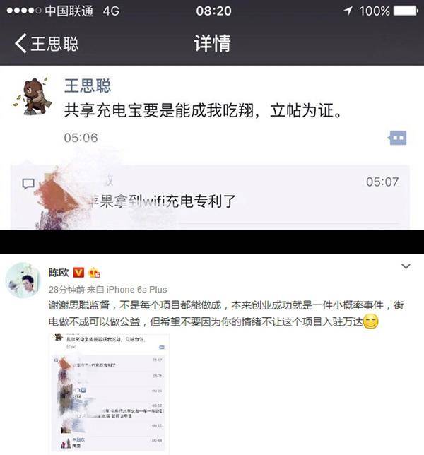 陈欧入局的最新项目是共享充电宝。而就在陈欧宣布将以3亿元人民币(现金)收购深圳街电科技有限公司的股权之际,“国民老公”王思聪怒摁共享充电宝项目,放言共享充电宝做不成,并且还立帖为证,“输了他吃翔”。