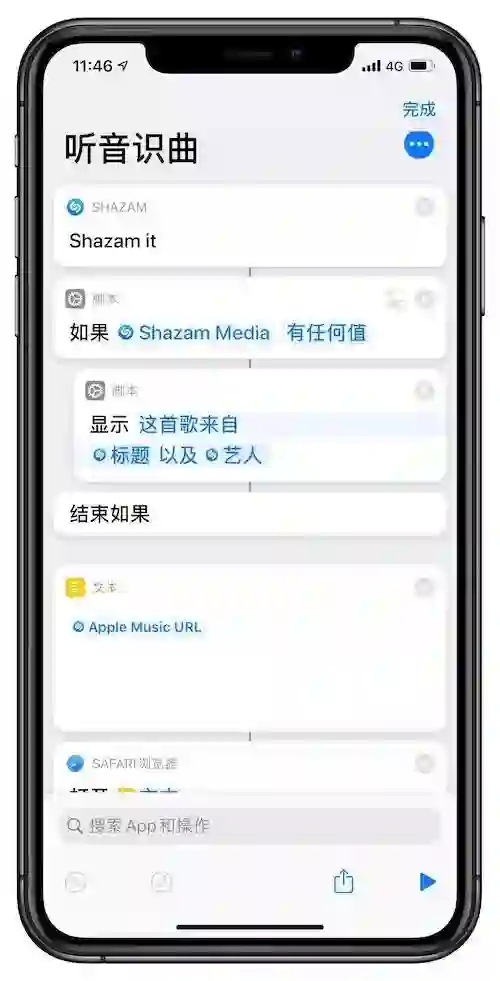 我自己就尝试制作了一个简单指令,让 Shazam 在辨认出歌曲后自动弹出歌曲和歌手名字,然后再自动跳转到 Apple Music 的对应歌曲页面上。