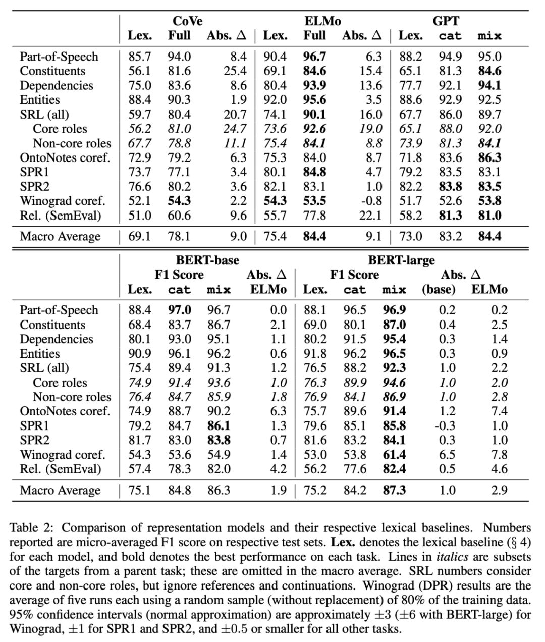 ELMo、CoVe和GPT都遵循类似的趋势(表2),显示出在被认为主要是语法上的任务(如依赖性和成分标记)上获得的收益最大,而在被认为需要更多语义推理的任务(如SPR和Winograd)上获得的收益较小。