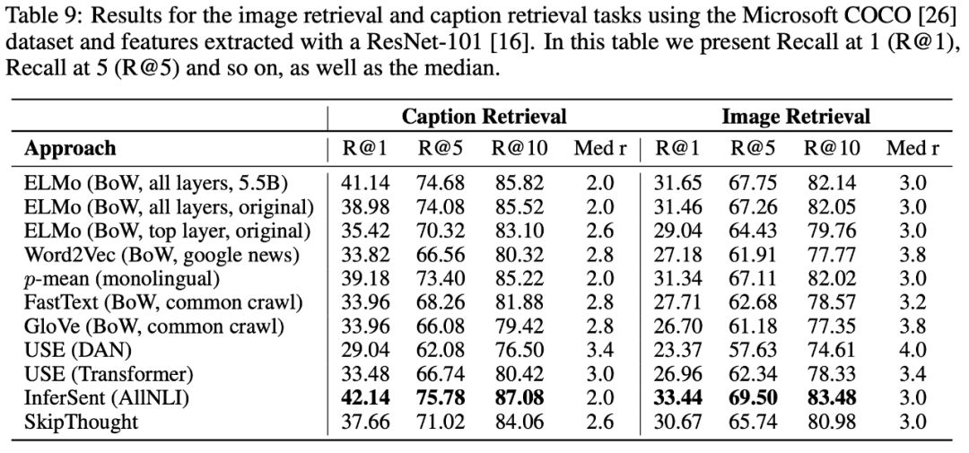 在图像标题检索任务中,每个图像和语言特征都要进行联合评估,其目标是对给定标题的图像集合进行排序(图像检索任务 — text2image)或对给定图像的标题进行排序(标题检索 — image2text)。InferSent是一个明显的赢家。第二名是ELMo。