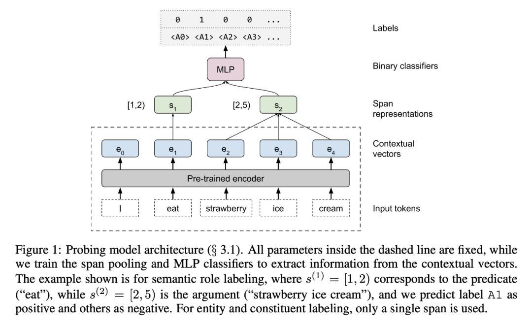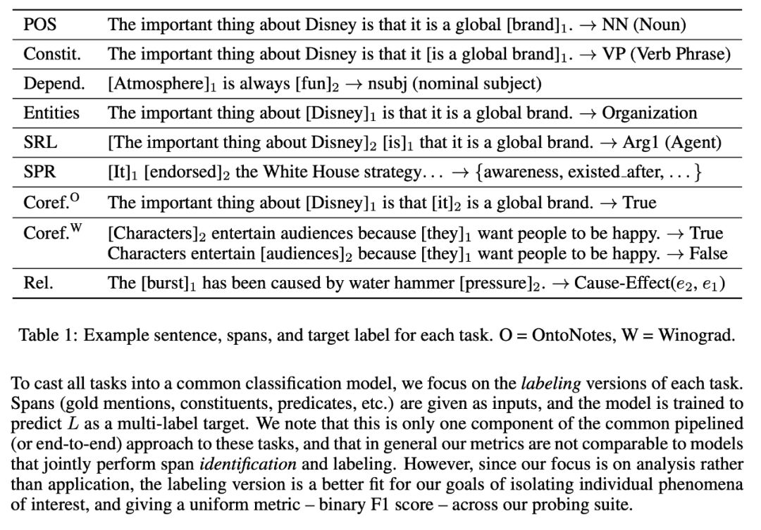 作者介绍了一套“边缘探测”任务,用于探测上下文化的词嵌入的子句结构。这些任务来源于核心的NLP任务,包含了一系列的语法和语义现象。