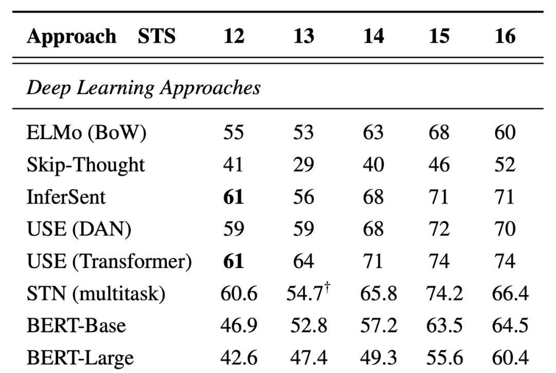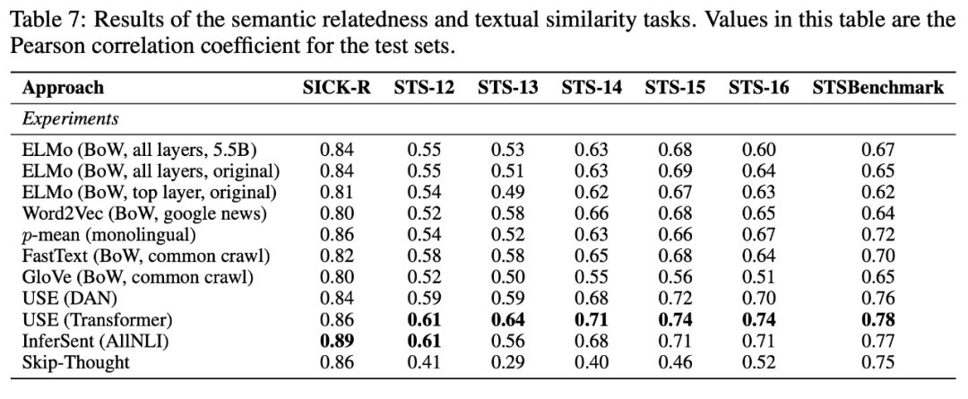 然后他们尝试了使用嵌入来处理语义关联和文本相似性的任务。这次使用(Transformer)模型显然是赢家。如果我们忽略了InferSent,它的嵌入比USE大8倍,USE远远领先于其他。