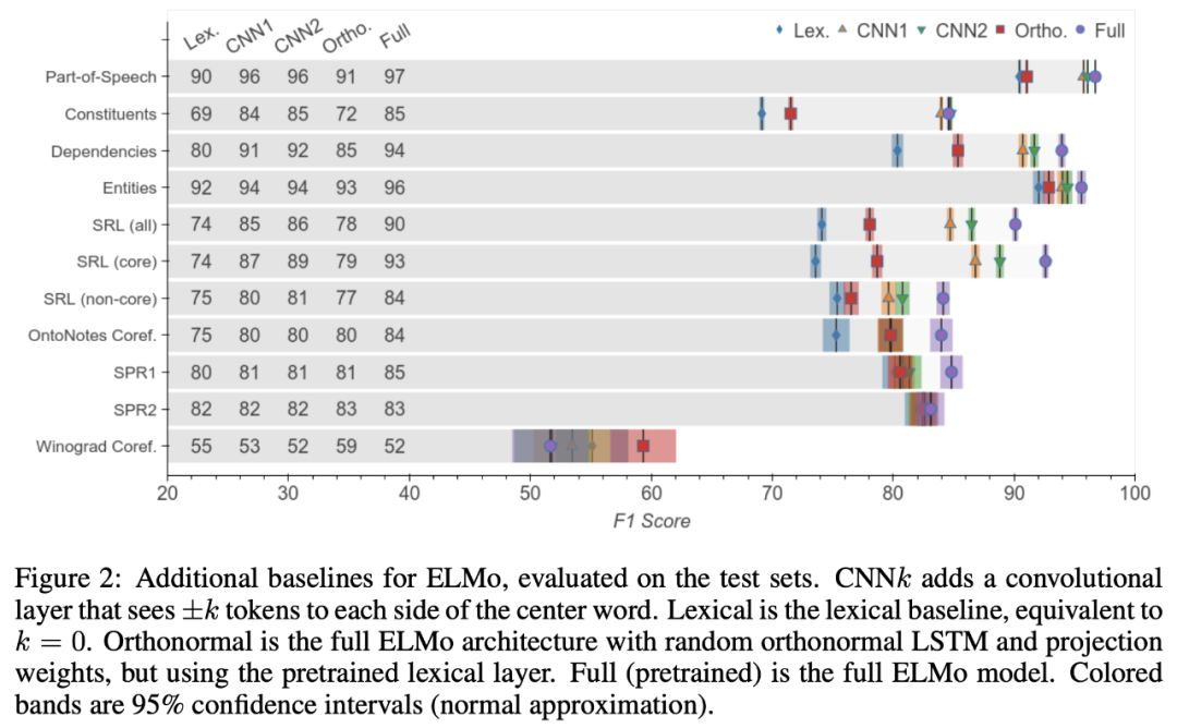 为了估计长距离传输的信息(几个tokens或多个tokens),作者使用卷积层扩展了词法基线,允许探测分类器使用本地上下文。如图2所示,添加宽度为3(±1 token)的CNN,可以缩小词法基线与完整ELMo之间的差距72%(平均任务),如果我们使用宽度为5(±2 tokens)的CNN,则可以扩展到79%。