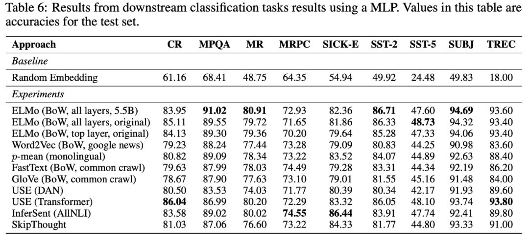 从结果中我们可以看到,不同的ELMo嵌入对于分类任务执行得非常好。USE和InferSent也在一些任务的顶部。最好和次好之间的差距大约是2%。Word2Vec和GloVe并没有像预期那样在任何任务中名列前茅,但它们的表现也在3%范围内。
