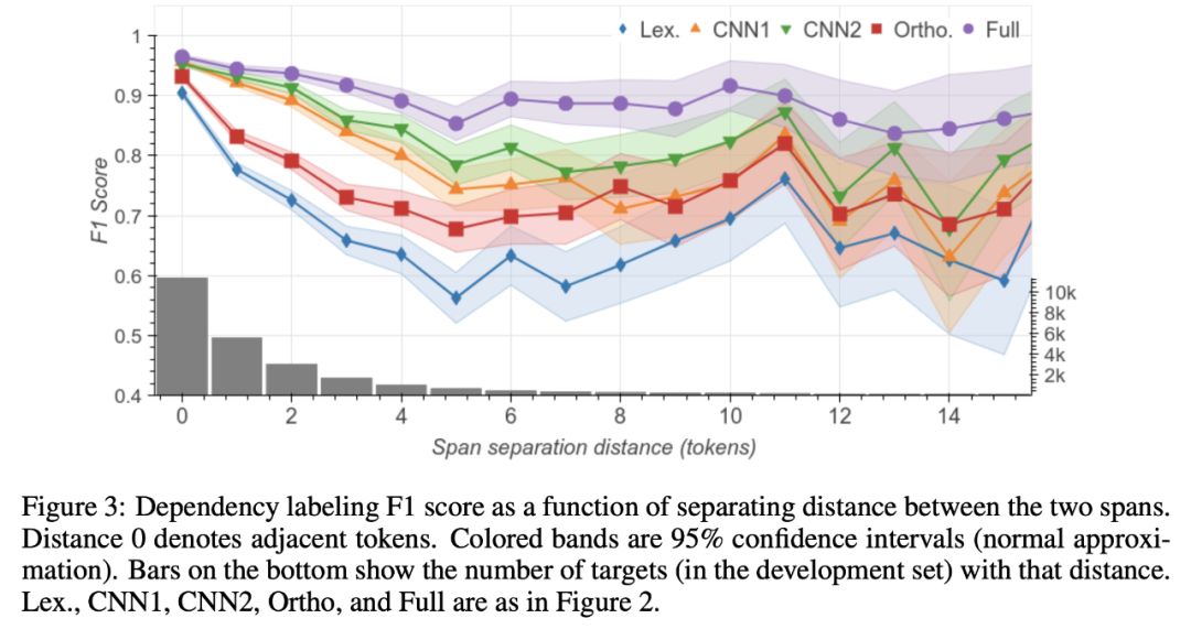 CNN模型和标准正交编码器在邻近跨距时表现最佳,但随着tokens距离的增加,其性能迅速下降。(该模型只能访问给定范围内的嵌入,如谓词 — 对,并且必须预测属性,如语义角色,这通常需要整个句子的上下文。)