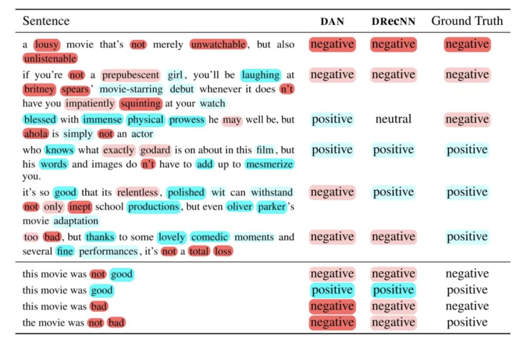 这使得(DAN)成为一个将新闻文章分类的好模型,但是在情感分类问题中,像“not”这样的词可能会改变意思。