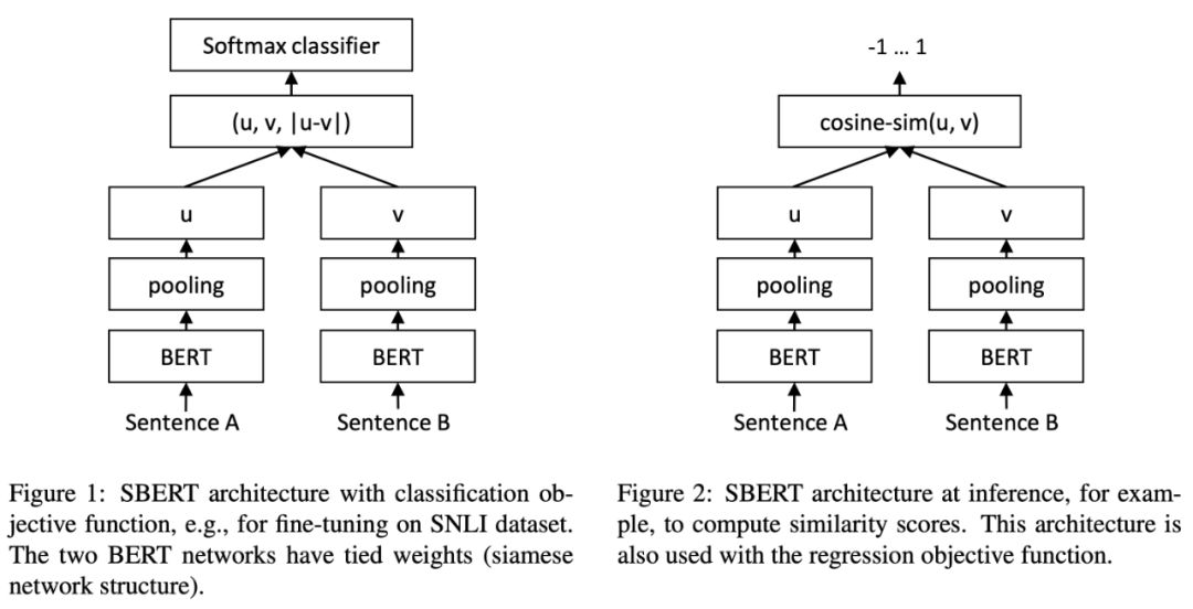 Sentence-BERT (SBERT)是预训练的BERT网络的一个修改,它使用siamese和triplet网络结构派生出语义上有意义的句子嵌入,可以使用余弦相似度进行比较。