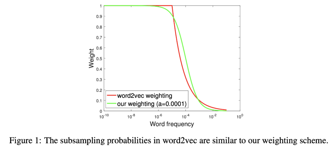 其中,以a为参数,**w = a/(a + p(w))**的权重,p(w)(估计值)的词频,他们称之为 — 平滑逆频率(SIF)。