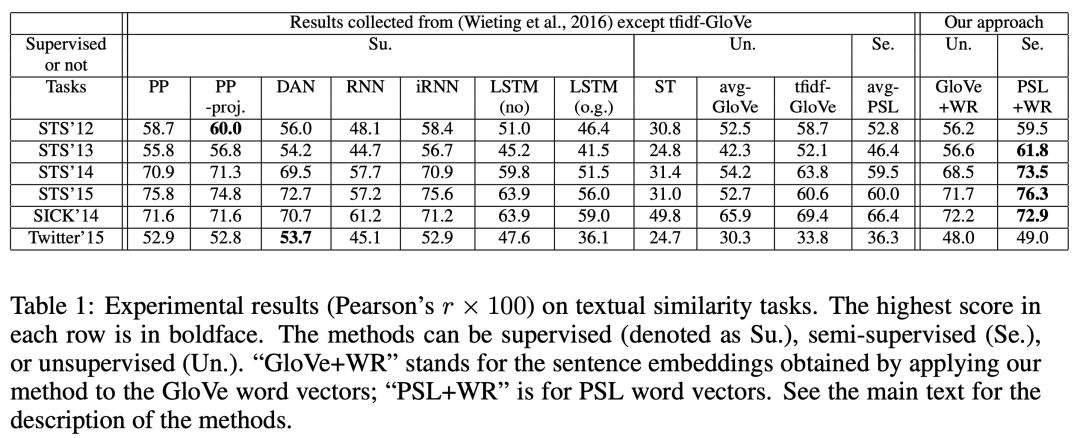 对于GloVe向量,单独使用平滑逆频率加权比未加权平均提高约5%,单独使用共分量去除提高10%,同时使用两者提高13%。