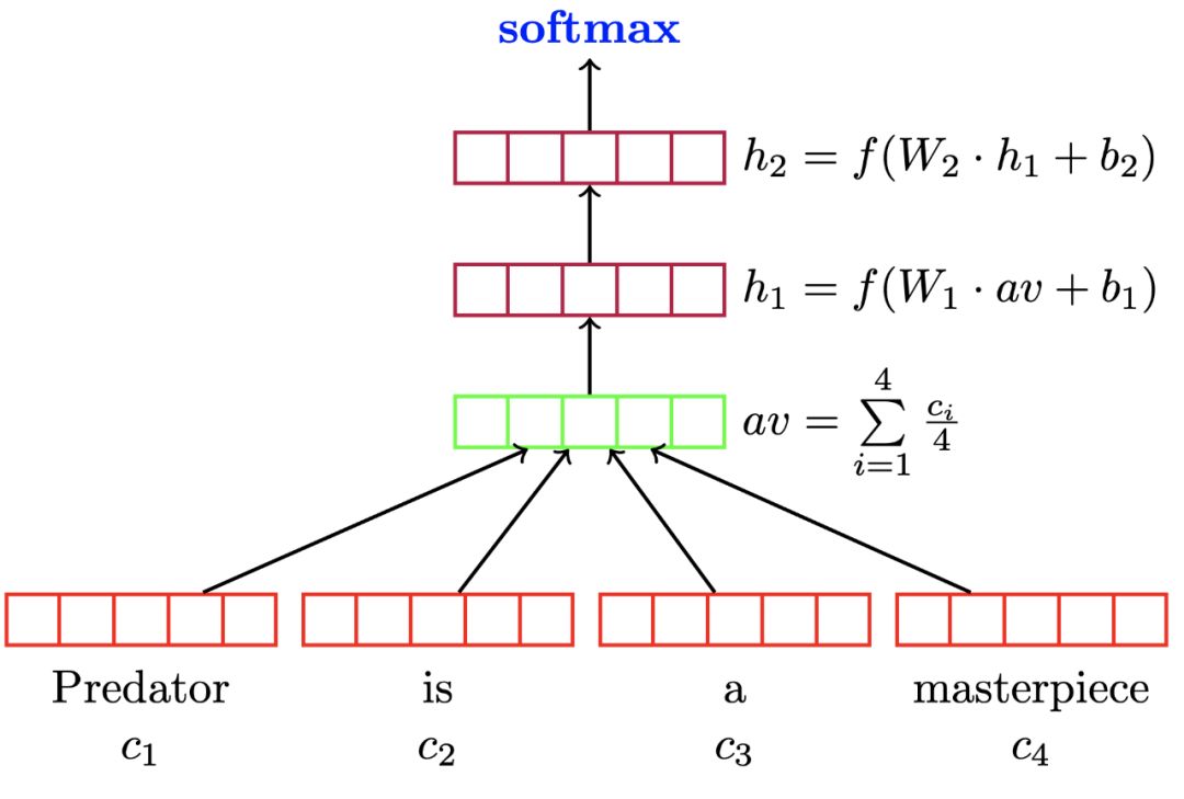 这是一个有争议的建模方法,因为它不考虑单词的顺序。首先将GloVe嵌入的词在一起做平均,然后通过前馈深度神经网络产生句子嵌入。