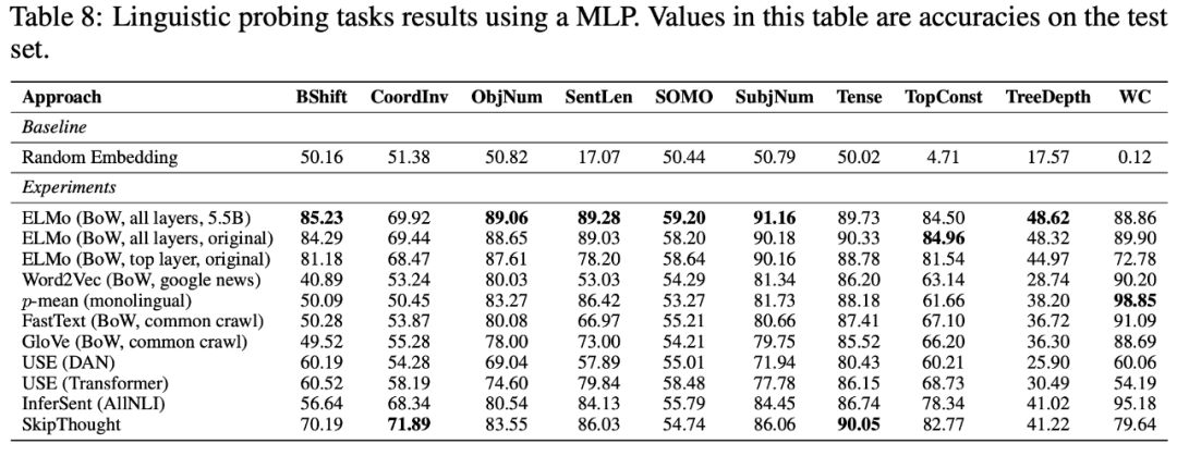 接下来,他们展示了由一些深奥任务组成的语法探索任务的结果。在这种情况下,ELMo似乎统治了世界!