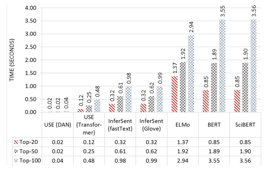 作者报告说BM25查询花费大约5毫秒来检索多达100个结果。通过不同的模型计算嵌入和重排20、50和100个标题所花费的额外时间如下所示。USE (DAN)是最快的,重新排序20或50个标题需要0.02秒,重新排序100个标题需要0.03秒。