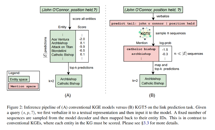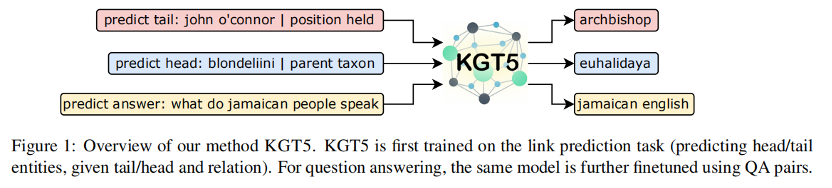 KGT5 首先在链接预测任务上进行训练(预测头/尾实体,给定尾/头和关系)。对于问答,使用 QA 对进一步微调相同的模型。方法的概述图如下: