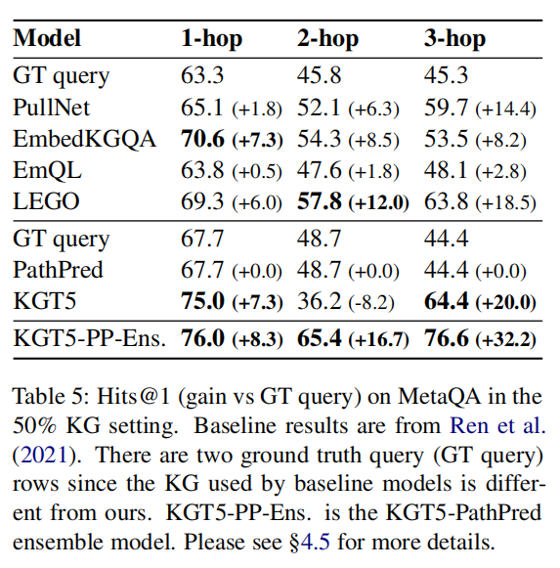下图显示了 MetaQA 数据集上的 hits@1 性能。然而,在 MetaQA 2-hop 上,与基线相比,性能明显更差,甚至比地面实况查询更差。为了解决这个问题并创建一个更忠实于不完整 KG 中存在的知识的模型,作者设计了一个带有 PathPred 基线的 KGT5 集合。集成工作如下:给定一个问题 q,尝试使用 PathPred 回答它。如果这返回一个空集,就使用 KGT5。