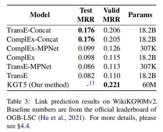类似地,下图显示了在WikiKG90Mv2上的链路预测性能。可以看出,KGT5在验证集上获得了最高的MRR,同时比排行榜上表现最好的模型少98%。