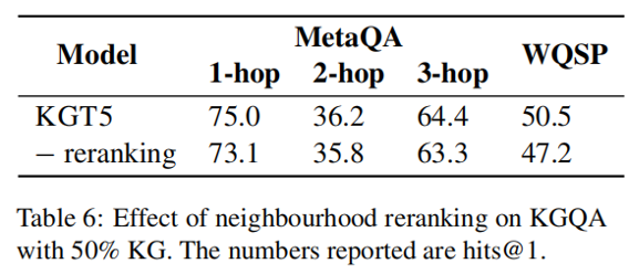 最后,作者进行了消融来研究邻域重新排序对 KGQA 性能的影响,发现重新排序在所有数据集上都带来了小而一致的收益。见下图: