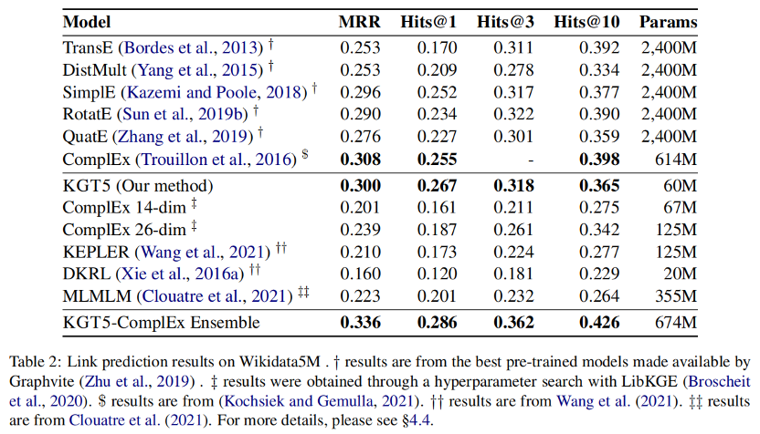 下图显示了 Wikidata5M 上的链接预测性能,这是一个更小但研究得更好的 KG。可以看到 KGT5 在所有指标上都优于所有低参数计数模型。与大型 ComplEx 模型相比,MRR 下降了 0.008 点,而 hits@1 则增加了 0.012 点。