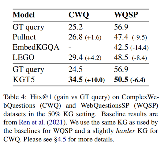 作者在两个数据集上评估了KGT5对于不完整KG的QA能力。在这两个数据集上,KGT5 都优于所有基线。就复杂性和 KG 大小而言,ComplexWebQuestions 是最难的数据集,其收益是最大的。
