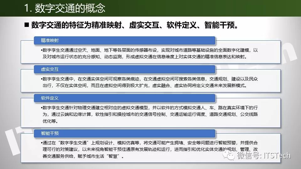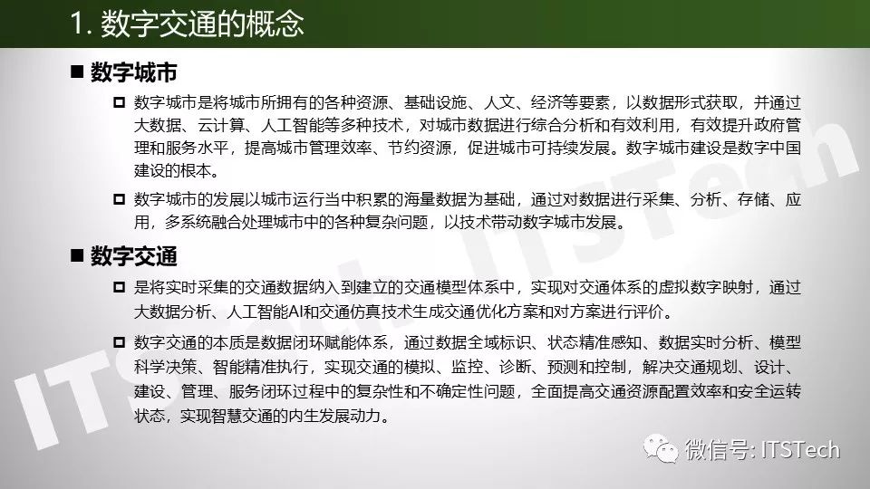 数字交通是将实时采集的交通数据纳入到建立的交通模型体系中,实现对交通体系的虚拟数字映射,通过大数据分析、人工智能AI和交通仿真技术生成交通优化方案和对方案进行评价。