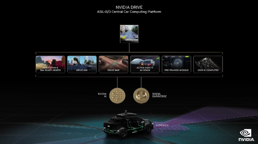NVIDIA Drive 是一个面向自动驾驶汽车开发与部署的端到端平台,在开发方面包含了 Replicator 合成数据生成、Drive Sim 和 Drive Map,在部署方面包含了全栈驾驶和车内 AI 应用、AI 计算机和 Hyperion 自动驾驶汽车参考架构。