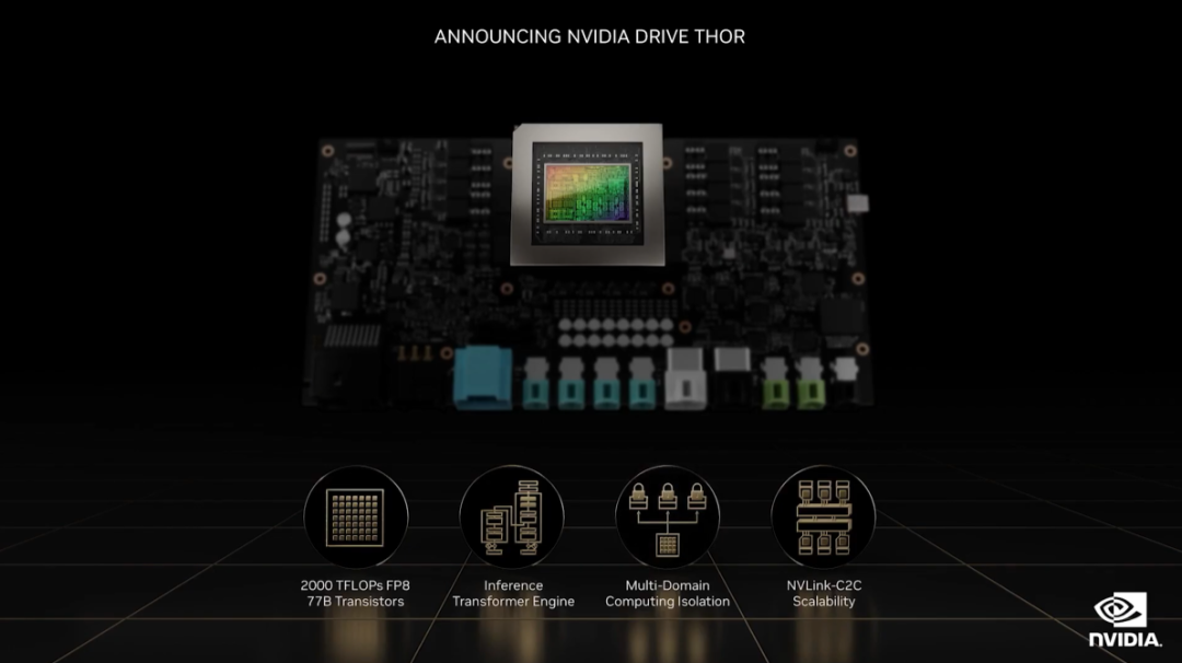 2021 年,英伟达推出了 1000 TOPS 的 SoC——Atlan。今天,黄仁勋表示它的位置已被 Thor 取代。Thor 的吞吐量是 Atlan 的两倍,交付性能也是 Atlan 的两倍以上。实现这些目标离不开三个因素:Grace、Hopper 和 Ada Lovelace,其中 Grace 提供了令人惊叹的 Transformer 引擎、ViT 的快速变革,Ada 中的多实例 GPU 有助于车载计算资源的集中化,将成本降低数百美元。