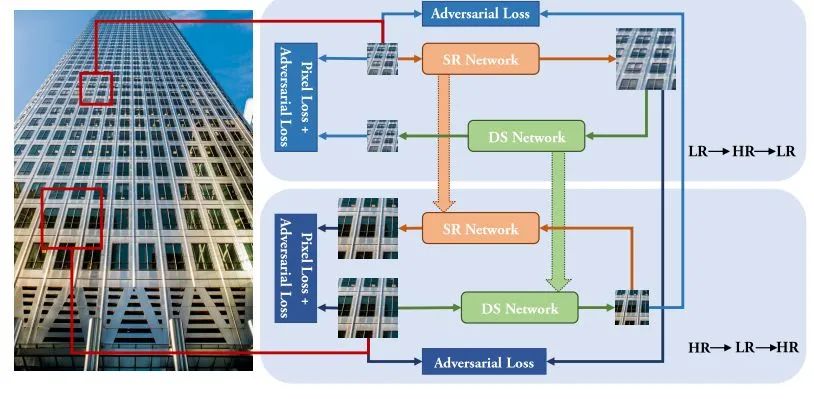 经过一顿操作,我们在一张图上搜出了好多高分辨(HR)和低分辨(LR)的不配对图像,接下来就是把LR——>HR和HR——>LR这两个网络训练好。这部分老司机都很熟悉,不就是CycleGAN么,对哈哈哈。