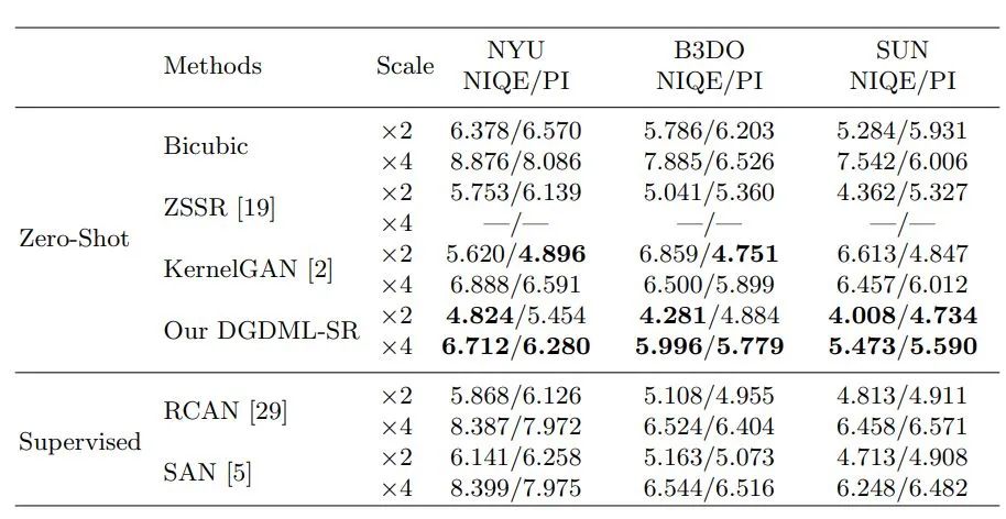 作者用了四个数据集:NYU depth V2 [20], B3DO [9], Xtion of SUN RGBD [25] and Urban100 [8] dataset。其中前三个有深度图,后一个没有深度图,因此需要用现成的网络预测一个深度图,再做。而且,这些个数据集都是没有gt(参考图像)的,因此需要用一些无参考评价指标,NIQE和PI。(其实这些无参考的指标比较玄学...)