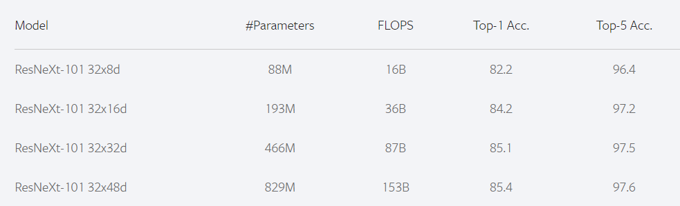 表2:使用不同规模、不同参数配置的ResNeXt-101模型获得的不同性能结果比较