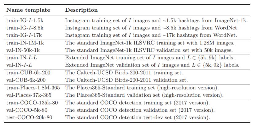 表1:图像分类数据集的摘要。每个数据集标明数据来源和功能(训练集,验证集,测试集),图像数量I和标签数量L。