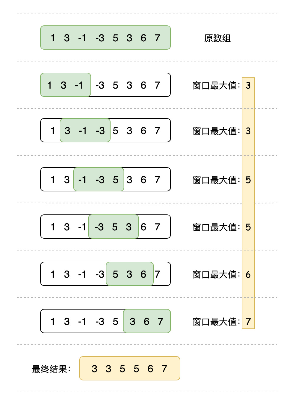 输入: nums = [1,3,-1,-3,5,3,6,7], 和 k = 3 输出: [3,3,5,5,6,7]