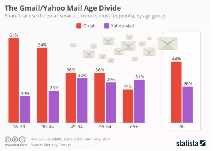 去年,Statista在对2500名美国成年人的调查中发现,有44%的人在使用Gmail,而使用Yahoo Mail的人数占比为29%,雅虎邮箱在65岁以上的人群中很受欢迎,在18-29岁的人群中,占比仅为19%,而使用Gmail的人达到61%。