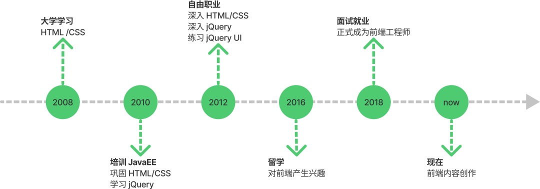 前边所有的经历,奠定了我转型前端所需要的技术基础。而在从事自由职业期间,我发现我还是喜欢看做得见的项目,从 0 设计界面,直至实现出来,很有成就感,并且我也享受在设计过程中,灵感迸发的快乐,心底就有了想转前端的火苗。不过第 2 份工作,从 2013 年到 2016 年,我仍然做的是 Java 开发。