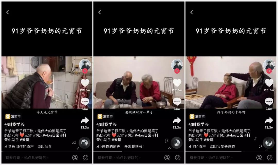 「叫我学长」把Vlog的主角设置为自己91岁的爷爷和奶奶,以老两口相爱70年后的日常生活为主题。第一支Vlog即播放量突破6000万,两个月累计收获上千万赞。
