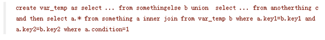 我不得不承认我原本的大脑的SQL语法依然是SQL-92时代,所以我无论如何不倾向于使用结构。但是如果你做一些像对复合PKS子句超重复的事 情,结构是方便的。不幸的是,Hive隔断了它们——尤其是在子句上,当然,在较小的数据集并没有这么做,也没有产生任何错误的时间。在绝对禁区,你得到 一个有趣的向量误差。这个限制是没有记录任何我所知道的地方。把这个看成是一个有序的方式来了解你的执行引擎的内部结构!