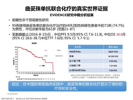 ToGA研究引领了HER2阳性晚期胃癌的抗HER2治疗时代到来,后ToGA时代的研究结果(PFS,OS)数值上均近似或优于ToGA,提示曲妥珠单抗可以同主流的胃癌一线化疗方案联用(蒽环类除外)。EVIDENCE研究中期分析结果显示,在中国的常规临床实践中,曲妥珠单抗联合化疗显示了很好的疗效和安全性。