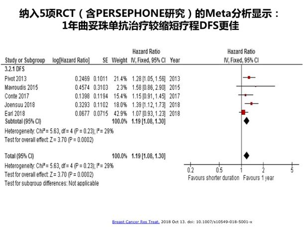 APT研究证实,HER2阳性低危小肿瘤减少化疗方案可行。那么,低危患者可以缩短抗HER2治疗疗程吗?遗憾的是目前进行的5项缩短疗程的研究均未能改变临床实践。纳入这5项RCT(含PERSEPHONE研究)的Meta分析也显示,1年曲妥珠单抗治疗较缩短疗程DFS更佳。