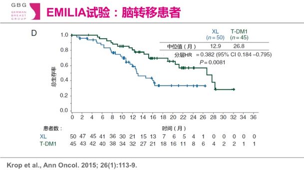 此外,HER2阳性患者易发生脑转移,伴脑转移的HER2+患者,预后较差。我们能否使用某种新型靶向药物和采用更佳的患者选择方法,以进一步改善伴有脑转移的HER2阳性乳腺癌患者的OS? 分析CLEOPATRA研究中以中枢神经系统进展作为首发部位的患者,帕妥珠单抗+曲妥珠单抗+多西他赛可以显著延长这部分患者的OS(34.4 vs 26.3个月)。EMILIA试验脑转移患者分析显示,T-DM1对比卡培他滨+拉帕替尼,显著延长脑转移患者的OS。