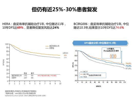 曲妥珠单抗改变HER2阳性乳腺癌患者预后,使HER2+早期乳腺癌患者获得治愈,达到10年以上无病生存期。但HERA研究和BCIRG006研究证实,仍有近25-30%的患者会在10年内复发。