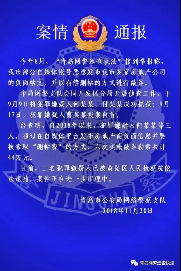 据齐鲁网 11月20日,青岛市公安局网络警察大队发布案情通报,自2018年以来,犯罪嫌疑人何某某等三人,通过自媒体平台发布房地产商负面信息并要挟索取“删帖费”的方式,六次实施敲诈勒索共计44万元。目前,三名犯罪嫌疑人已被黄岛区人民检察院依法逮捕,案件正在进一步审理中。