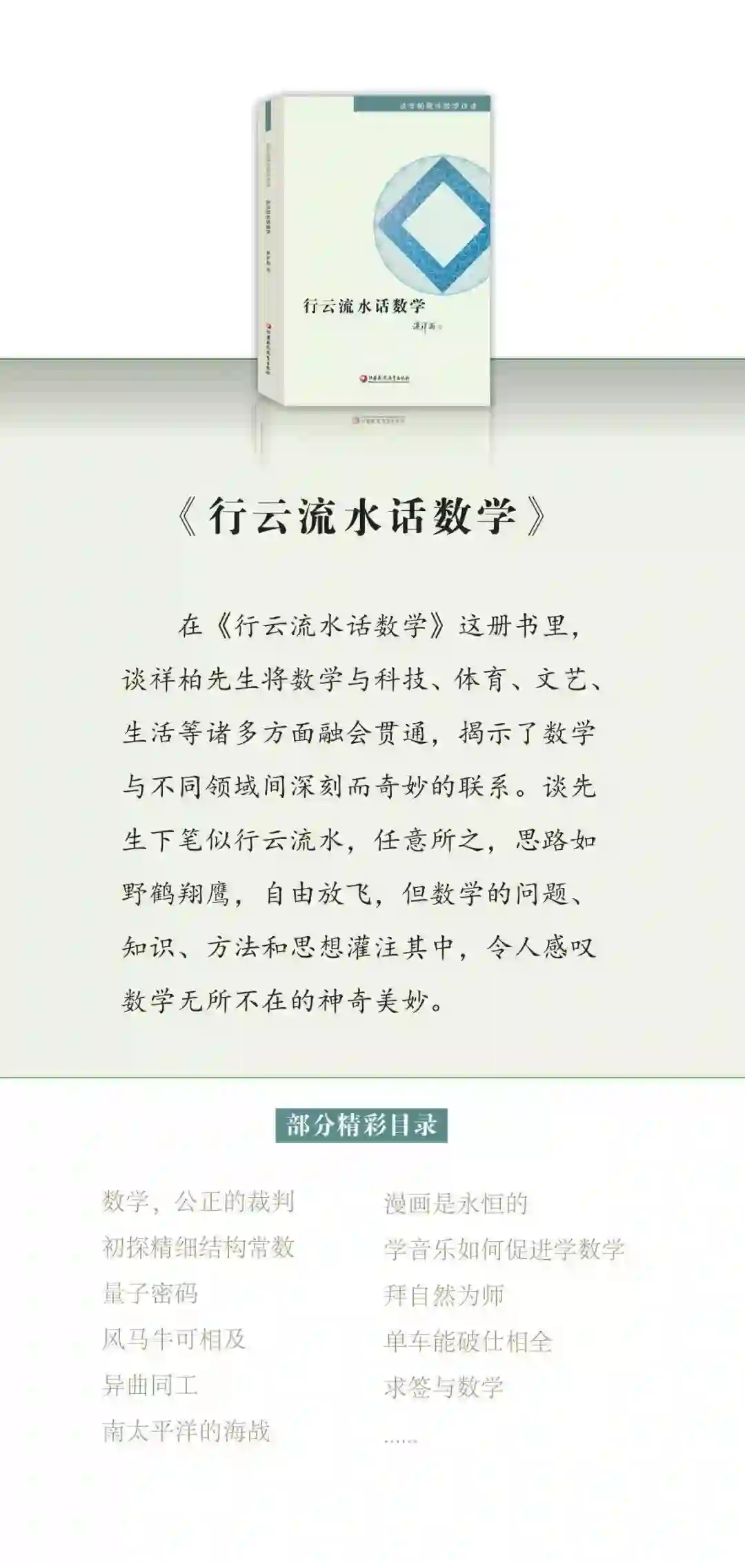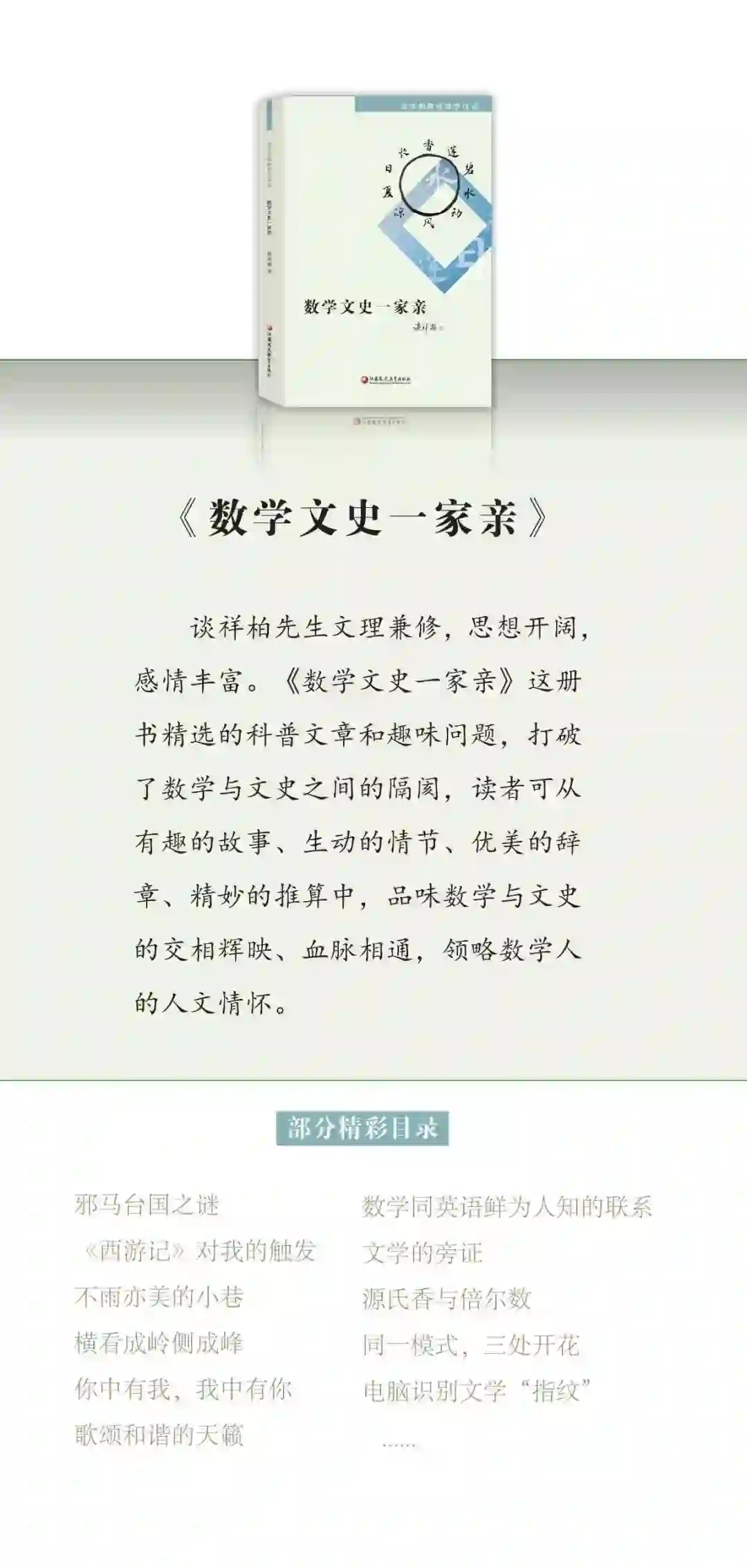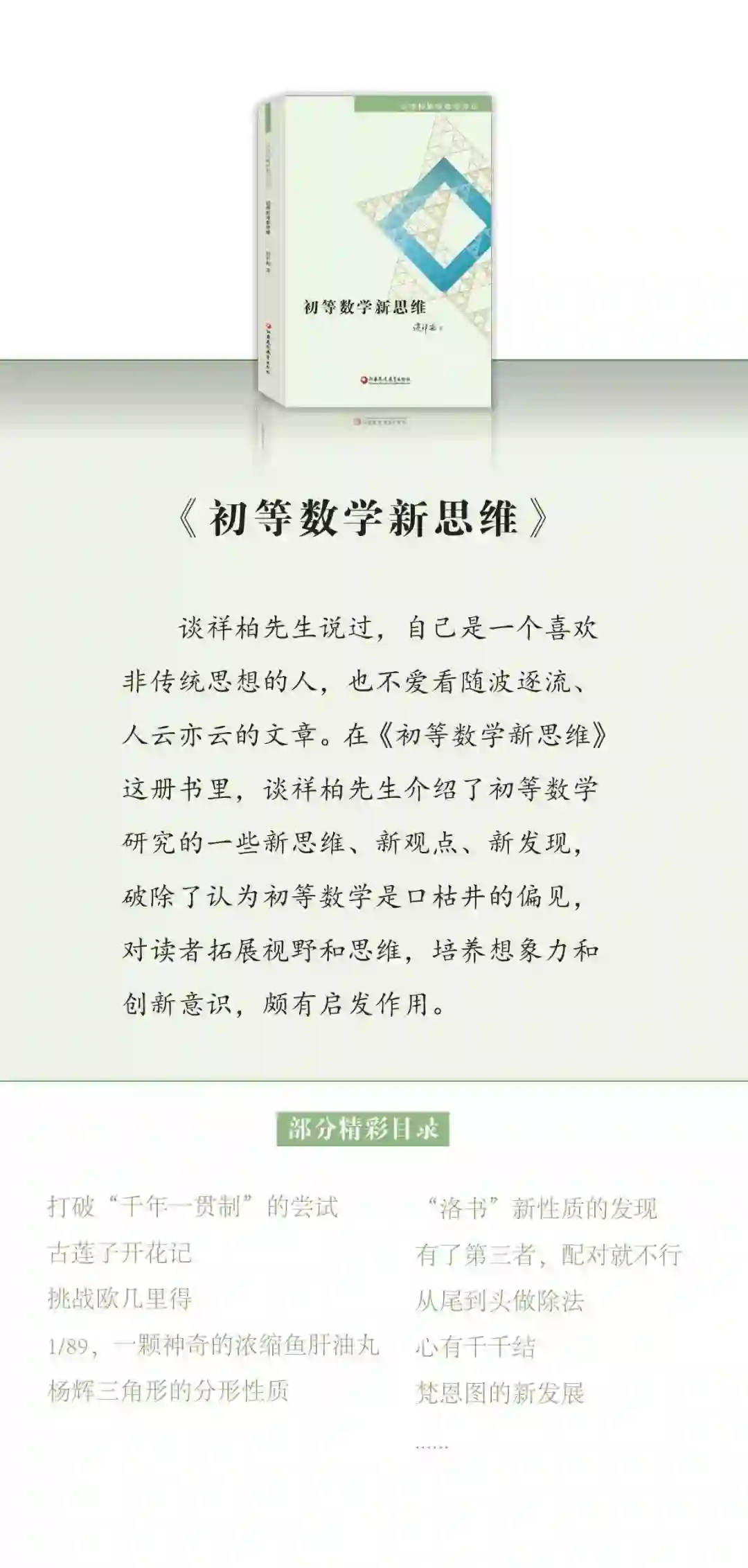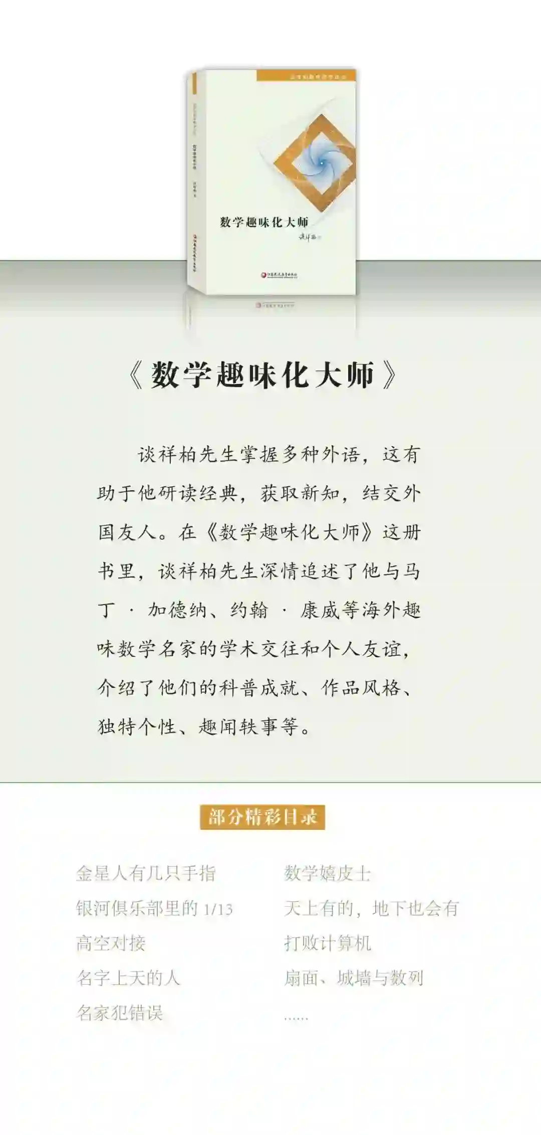 近日,数学科普丛书《谈祥柏趣味数学详谈》由江苏凤凰教育出版社正式出版。该丛书是我国数学科普大家谈祥柏教授具有“代全集”性质的十卷本文集,反映了谈祥柏教授数学科普创作的代表性成果和鲜明的个人风格。谈教授的数学科普作品,文理交融,奇趣横生,雅俗共赏,自出机杼,堪称数学文化宝库中独放异彩的明珠。