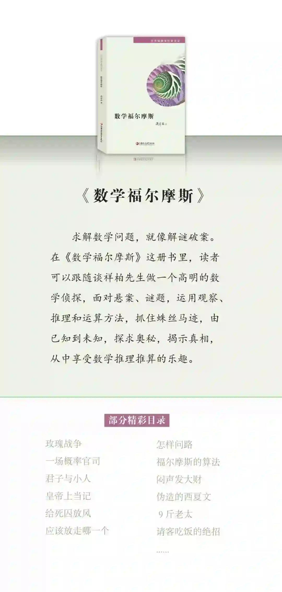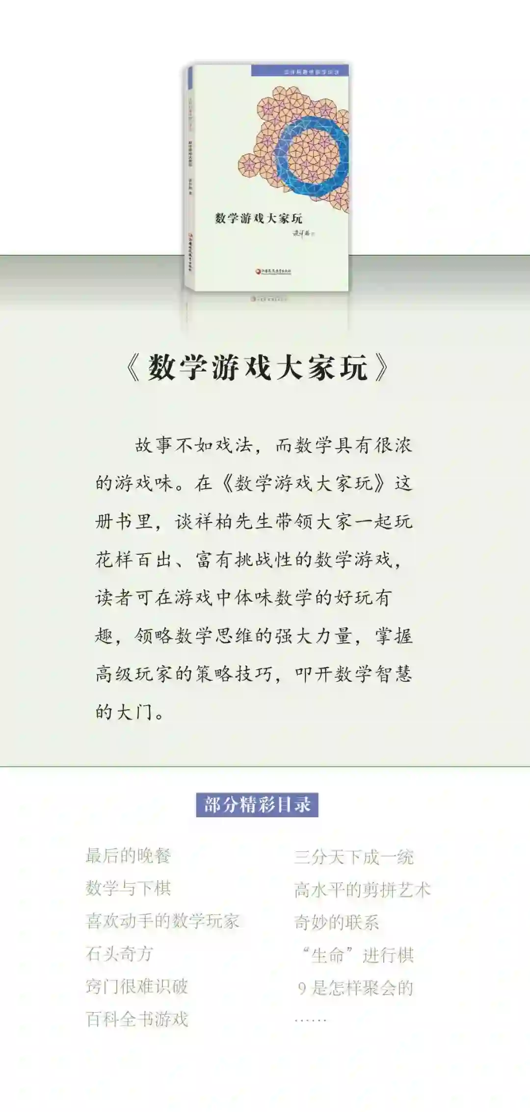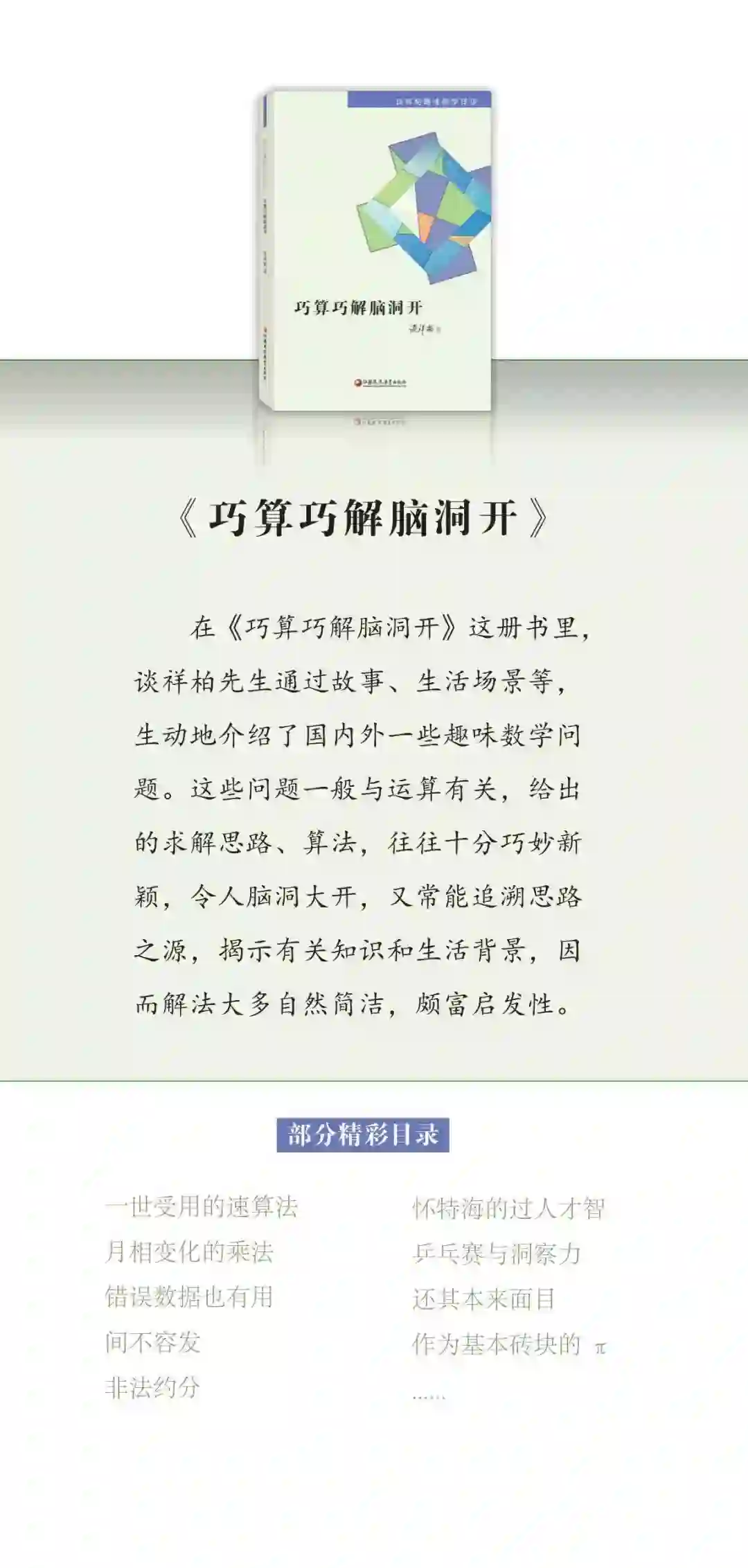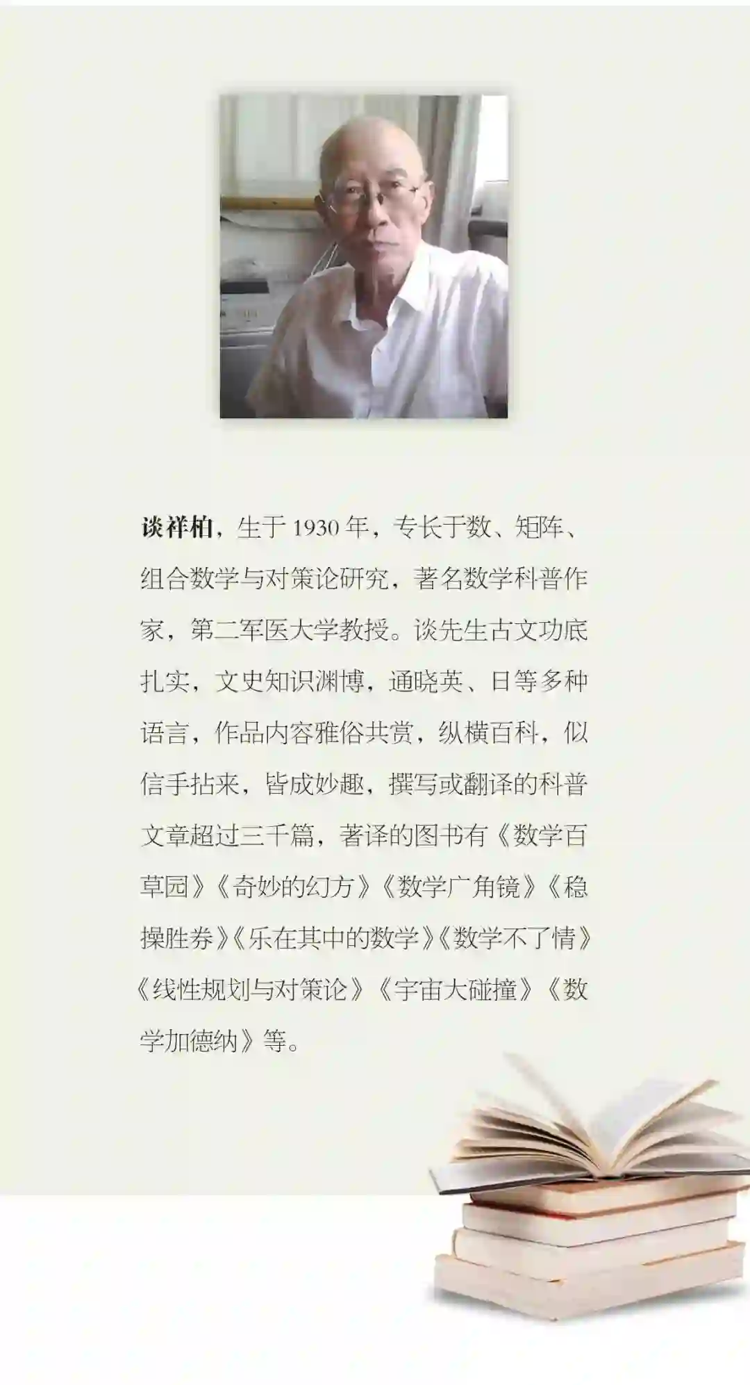 近日,数学科普丛书《谈祥柏趣味数学详谈》由江苏凤凰教育出版社正式出版。该丛书是我国数学科普大家谈祥柏教授具有“代全集”性质的十卷本文集,反映了谈祥柏教授数学科普创作的代表性成果和鲜明的个人风格。谈教授的数学科普作品,文理交融,奇趣横生,雅俗共赏,自出机杼,堪称数学文化宝库中独放异彩的明珠。
