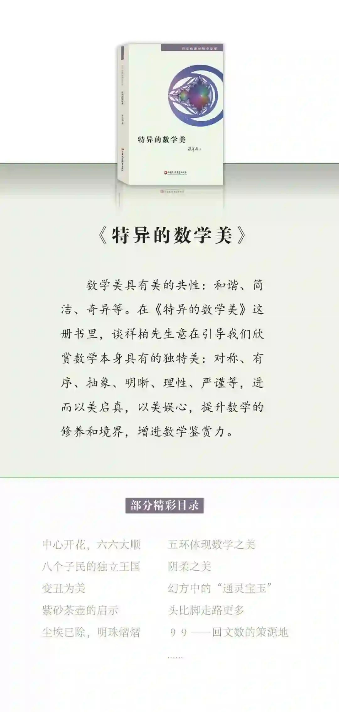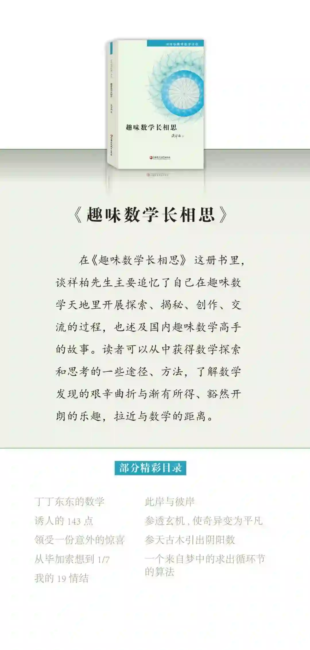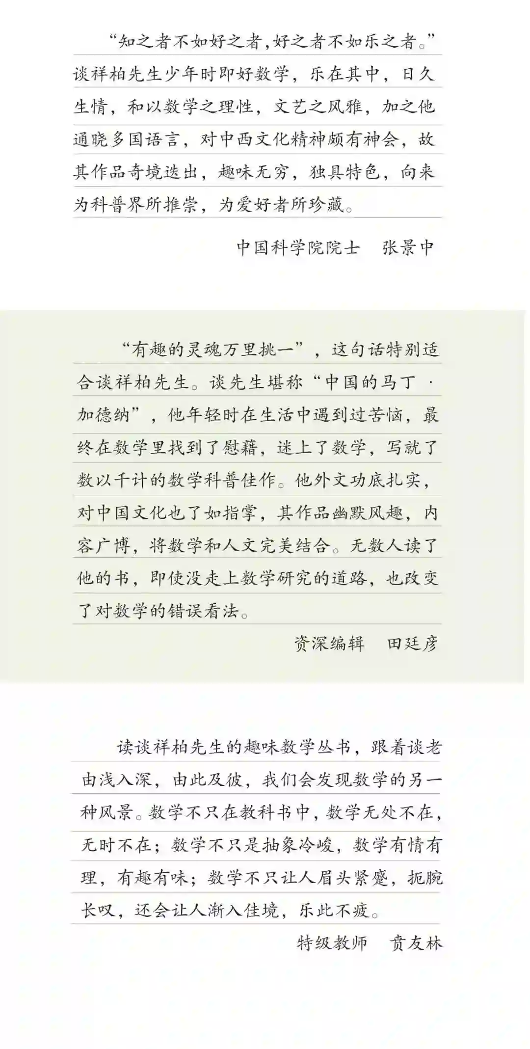 丛书中大部分作品系首次结集出版,所有作品经过深入研究、系统整理和精心编校。尤其是谈祥柏先生发表在《科学》《科学画报》《小学数学教师》《教育研究与评论》等期刊上的文章,对于一些类别自然数的本性的研究,对于数学与科学、文史、艺术关联性的探求,对于许多趣味数学内容背景的发掘等,深入而独特,兼具学术性、趣味性和人文性,令人回味无穷, 脑洞大开,对于广大中小学师生增进数学兴趣、拓展数学思维、提高数学素养、培养创新意识大有裨益。