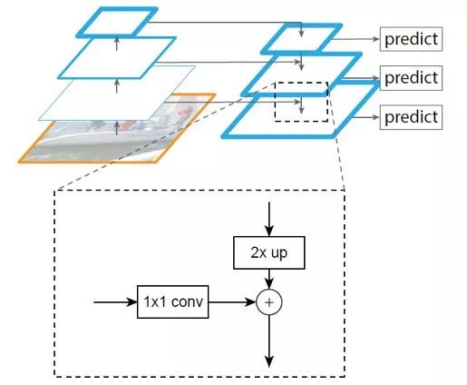 2017 年 Facebook 的 Tsung-Yi Lin 等提出了 FPN 算法,利用不同层的特征图进行不同尺寸的目标预测。原来多数的目标检测算法都是只采用深层特征做预测,低层的特征语义信息比较少,但是目标位置准确;高层的特征语义信息比较丰富,但是目标位置比较粗略。另外虽然也有些算法采用多尺度特征融合的方式,但是一般是采用融合后的特征做预测,而 FPN 算法不一样的地方在于预测是在不同特征层独立进行的,利用深层特征通过上采样和低层特征做融合。