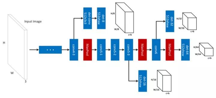 针对 YOLO 类算法的定位精度问题,2016 年 12 月北卡大学教堂山分校的 Wei Liu 等提出 SSD 算法,将 YOLO 的回归思想和 Faster R-CNN 的 anchor box 机制结合。通过在不同卷积层的特征图上预测物体区域,输出离散化的多尺度、多比例的 default boxes 坐标,同时利用小卷积核预测一系列候选框的边框坐标补偿和每个类别的置信度。在整幅图像上各个位置用多尺度区域的局部特征图边框回归,保持 YOLO 算法快速特性的同时,也保证了边框定位效果和 Faster R-CNN 类似。但因其利用多层次特征分类,导致其对于小目标检测困难,最后一个卷积层的感受野范围很大,使得小目标特征不明显。