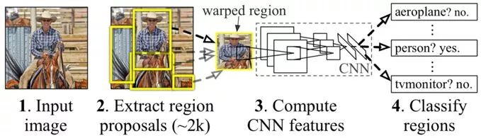 在早期深度学习技术发展进程中,主要都是围绕分类问题展开研究,这是因为神经网络特有的结构输出将概率统计和分类问题结合,提供一种直观易行的思路。国内外研究人员虽然也在致力于将其他如目标检测领域和深度学习结合,但都没有取得成效,这种情况直到 R-CNN 算法出现才得以解决。