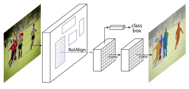 为了解决 R-CNN 算法为代表的 two stage 的方法问题,2017 年 Facebook 的何恺明等提出了 Mask R-CNN 算法,取得了很好的识别效果。Mask R-CNN 算法将 ROI_Pooling 层替换成了 ROI_Align,并且在边框识别的基础上添加分支 FCN 层(mask 层),用于语义 Mask 识别,通过 RPN 网络生成目标候选框,再对每个目标候选框分类判断和边框回归,同时利用全卷积网络对每个目标候选框预测分割掩膜。加入的掩膜预测结构解决了特征图像和原始图像上的 ROI 不对准问题,避免对 ROI 边界做任何量化,而用双线性插值到对准特征,再用池化操作融合。掩膜编码了输入图像的空间布局,用全卷积网络预测每个目标候选框的掩膜能完整的保留空间结构信息,实现目标像素级分割定位。