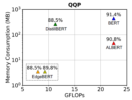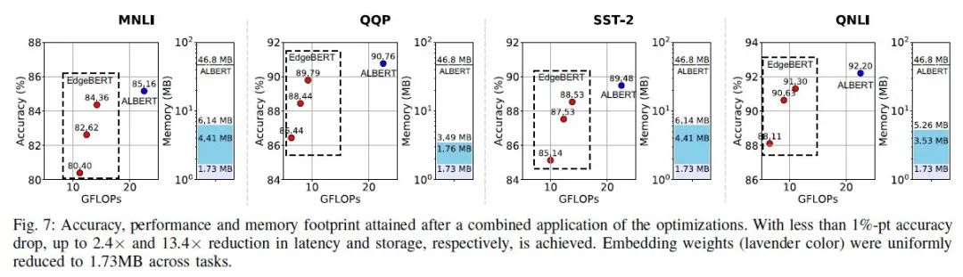 在性能(准确度)相比 ALBERT 下降 1 个百分点时,EdgeBERT 能取得的内存降低和的推理速度;下降 5 个百分点时甚至能取得的推理速度。